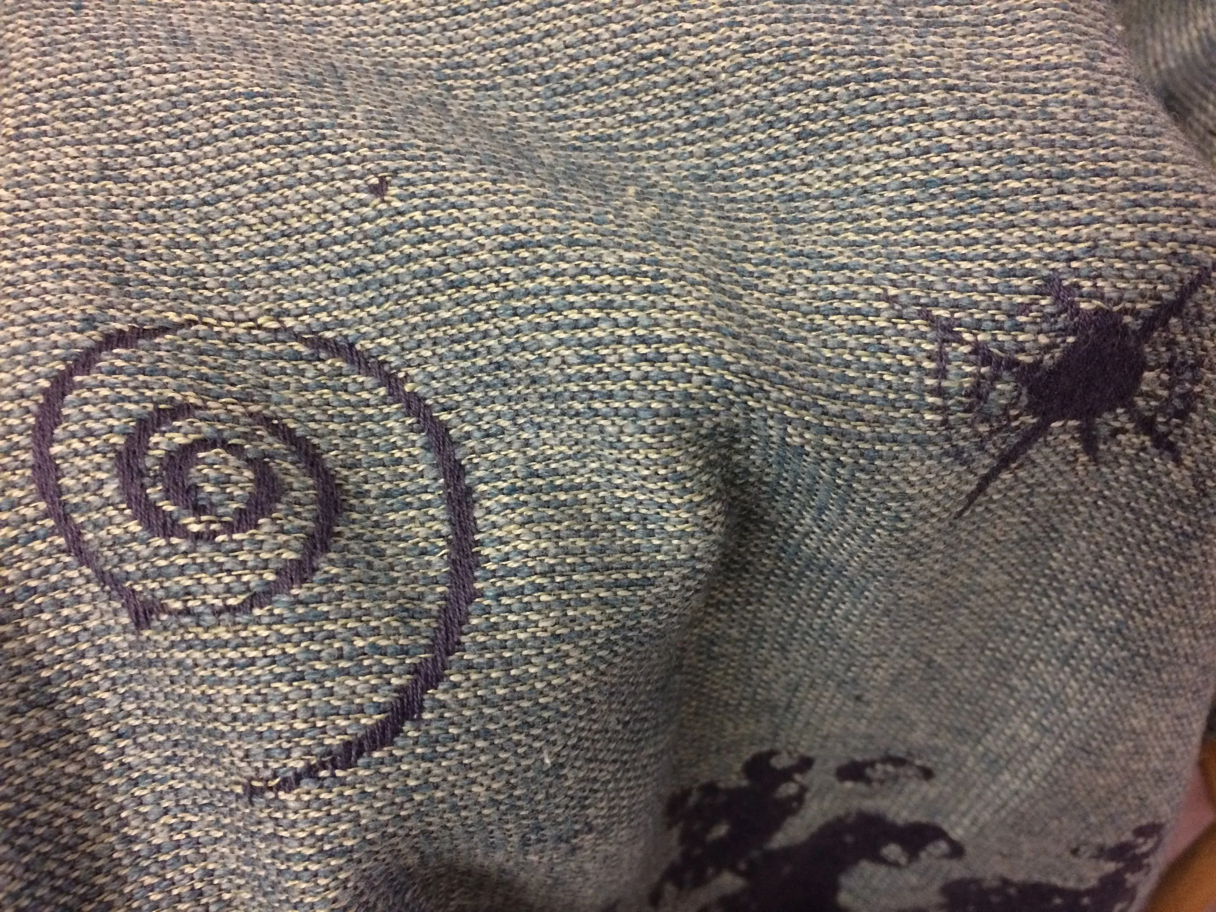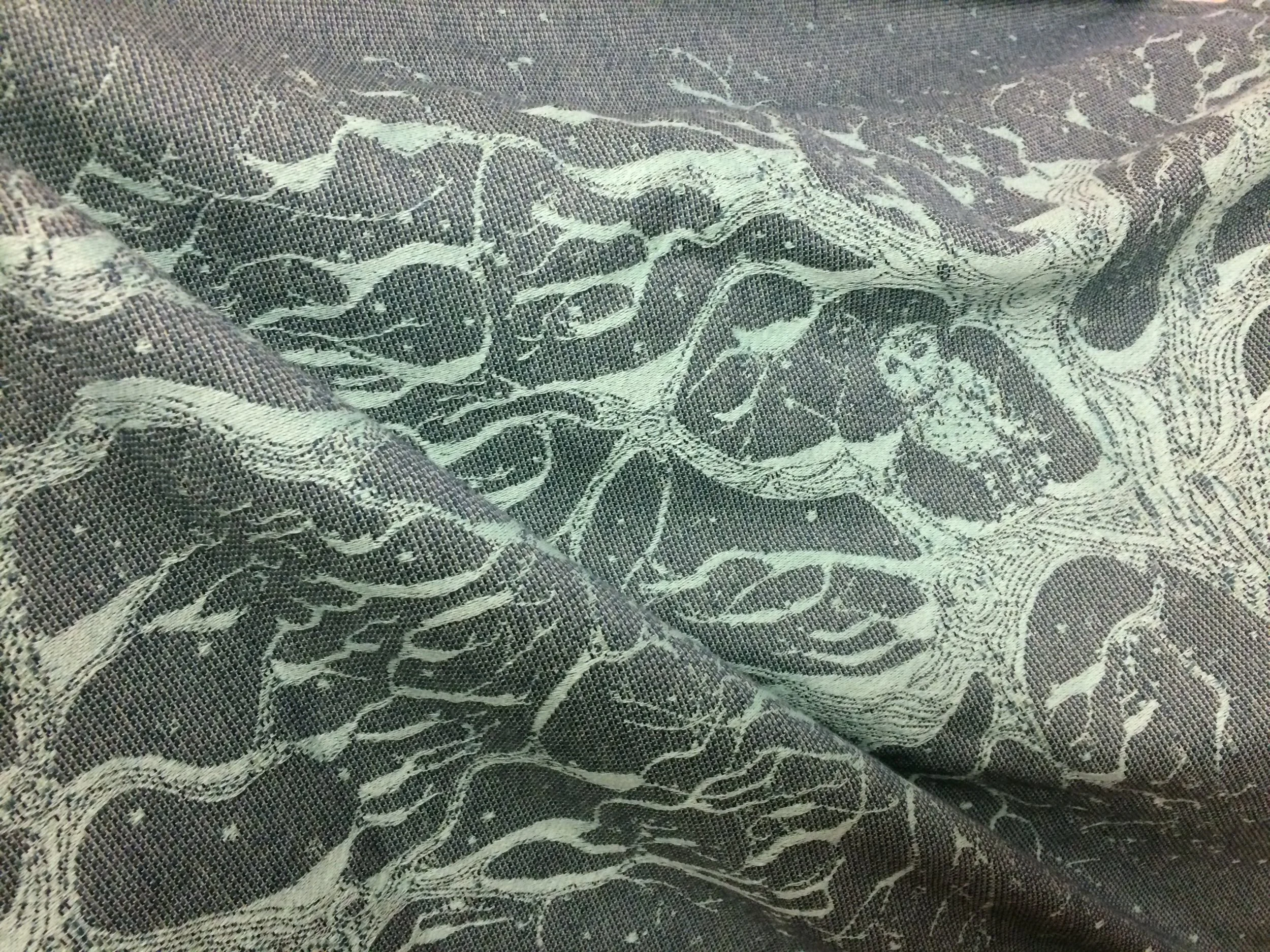 This Little Fellows exclusive, Space Monster has a hand-dyed silk warp and hand-dyed cotton weft, and is woven in their heart twill weave. With sparkles woven into the tails and middle marker it's an absolute beauty. I spent ages trying to take a photograph that did it justice and failed miserably. The subtle colours, sparkles and complex texture are impossible to capture, but the drape and diagonal stretch are unmistakable. I'll bet this one wraps like a bandage.