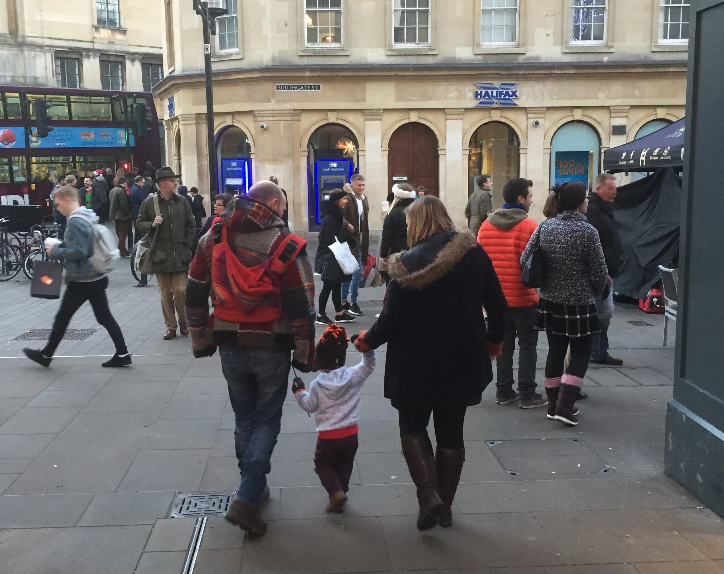 Last weekend we ventured out on our annual weekend trip to the Bath Christmas market. For the uninitiated, this is akin to venturing into a scene of The Walking Dead where a crush of thousands of zombies, thirsty for human flesh (well, mulled wine, pies and festive gifts anyway!) descend on the narrow city streets. I honestly don't know how people with young children manage to get through it alive without babywearing. We saw pushchairs being accidentally sat on by people in shoulder-to-shoulder crowds and parents being unable to move without putting their little ones on their shoulders to 'fight' their way out. Our little man however had a whale of a time up on Daddy's back where he could see everything, and we managed to have a largely stress-free day.