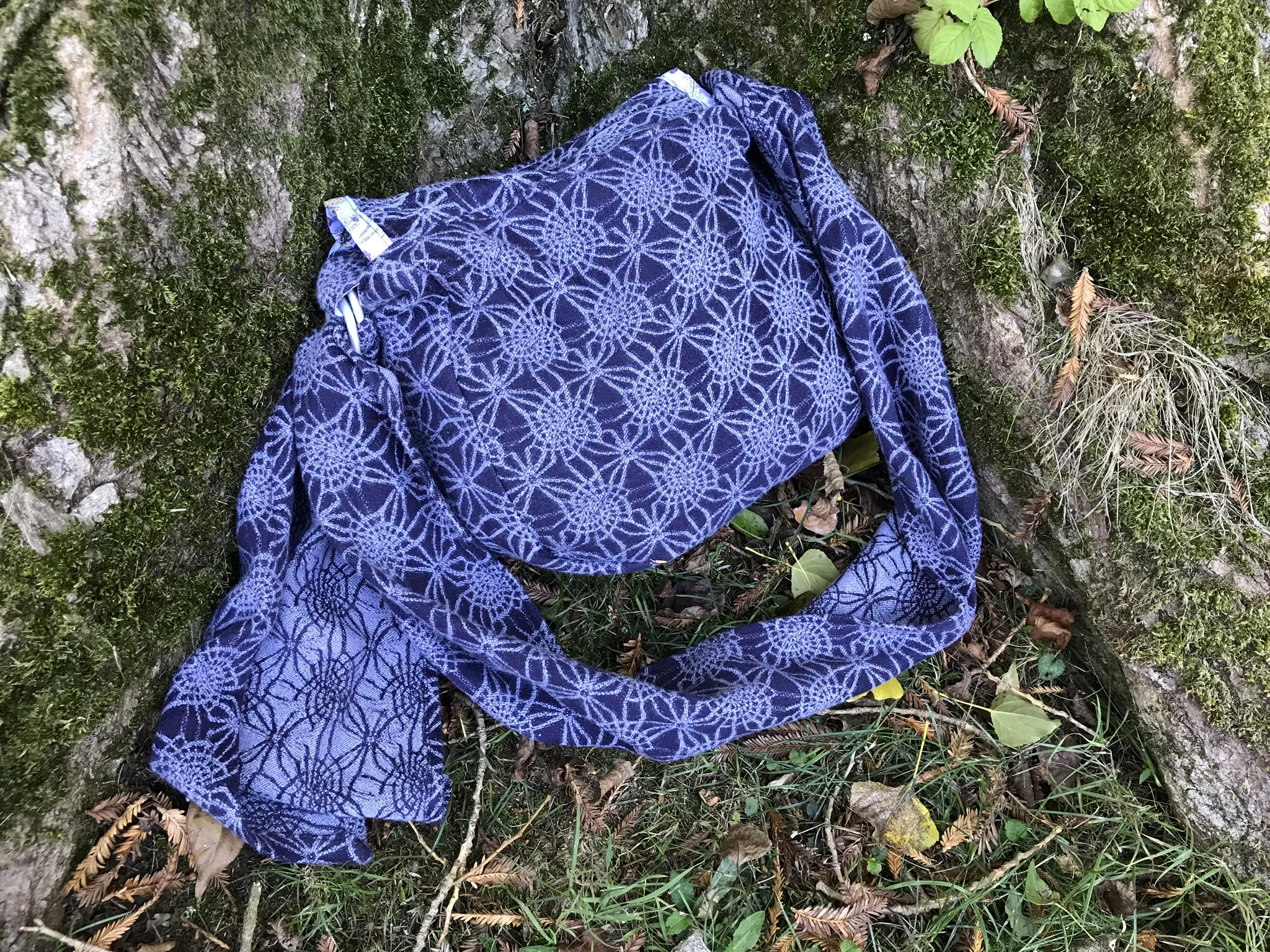 Alison’s babywearing bag design has been perfected following extensive testing & feedback from babywearers. It’s large enough to carry all the usual ‘child stuff’ and has a zip at the top to prevent said stuff spilling all over the floor at inopportune moments. It has internal pockets to house phones, keys or cards so they don’t get lost in amongst the rest of the rubbish you cart around, a large flat section at the front perfect for a magazine or muslin, and even has a strap across the base that’s perfect for stuffing a child’s jumper or jacket (or even a lightweight shorty wrap) for easy access. The real magic in the design is in the wrap style strap though. Wide and comfortable, it moulds over your shoulder and around your little one whether they’re on your front or back. This spreads the weight of the bag and, when made from a cushy woolly wrap like my Firespiral Grape Twilight Fractals, really cushions your shoulder. The length of the strap is fully adjustable thanks to the sling ring fastening, and it has no buckles to dig into you or your little one. When babywearing it looks and feels like a little extra wrap pass around the two of you.